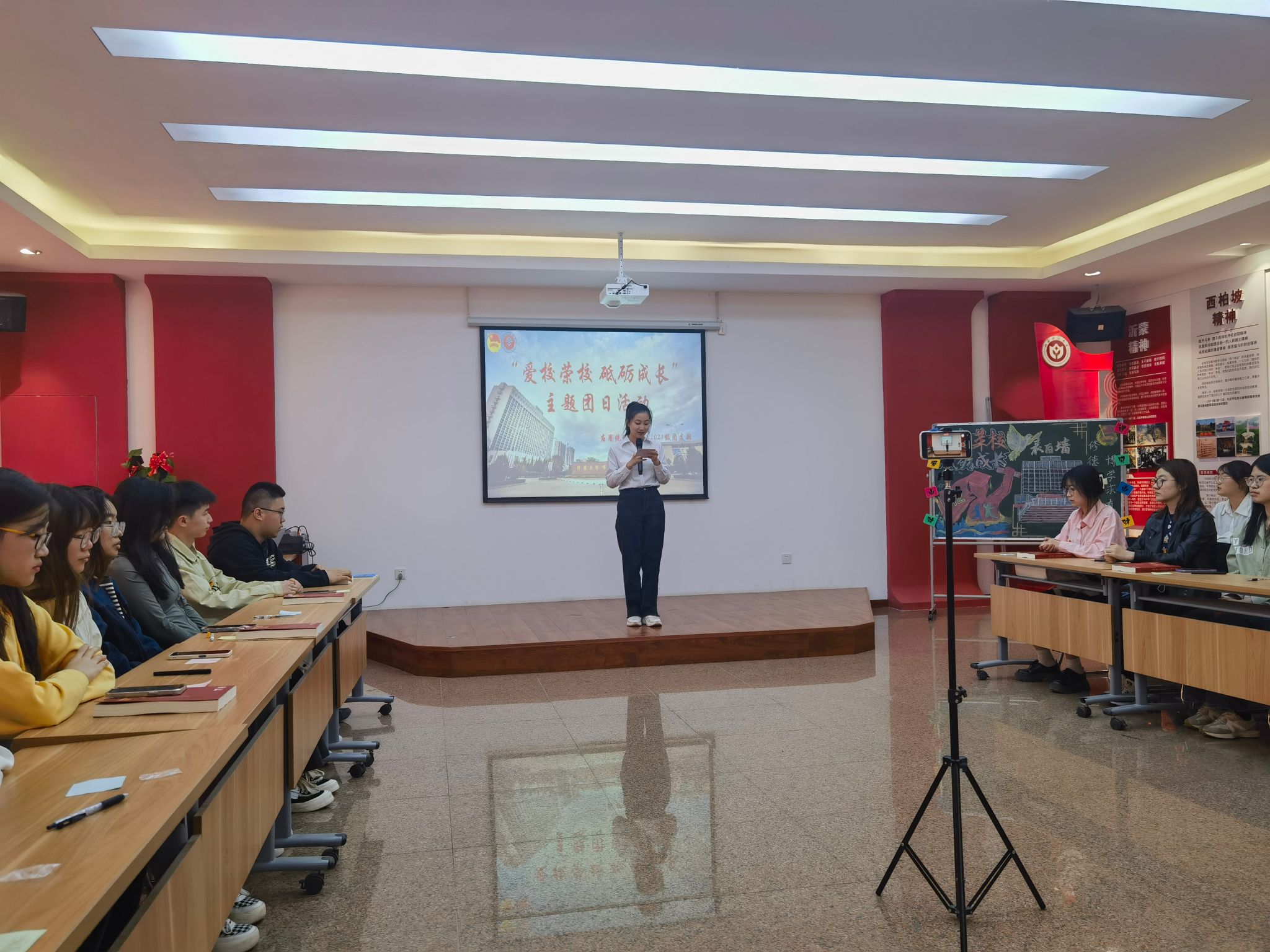 以青春之声,谱爱校华章。4月以来,为迎接建校72周年,学院各团支部围绕“爱校荣校 砥砺成长”为主题,深入开展校情校史教育,激发学生爱校荣校情怀。4月27日下午,应用统计学专业2021级团支部于在坞城校区红馆开展的 “爱校荣校 砥砺成长”班级主题团日活动,把活动推向了高潮。校团委书记、学院党委副书记、部分学院团委书记、学院全体辅导员现场观摩了活动。本次班级主题团日活动分三个阶段。